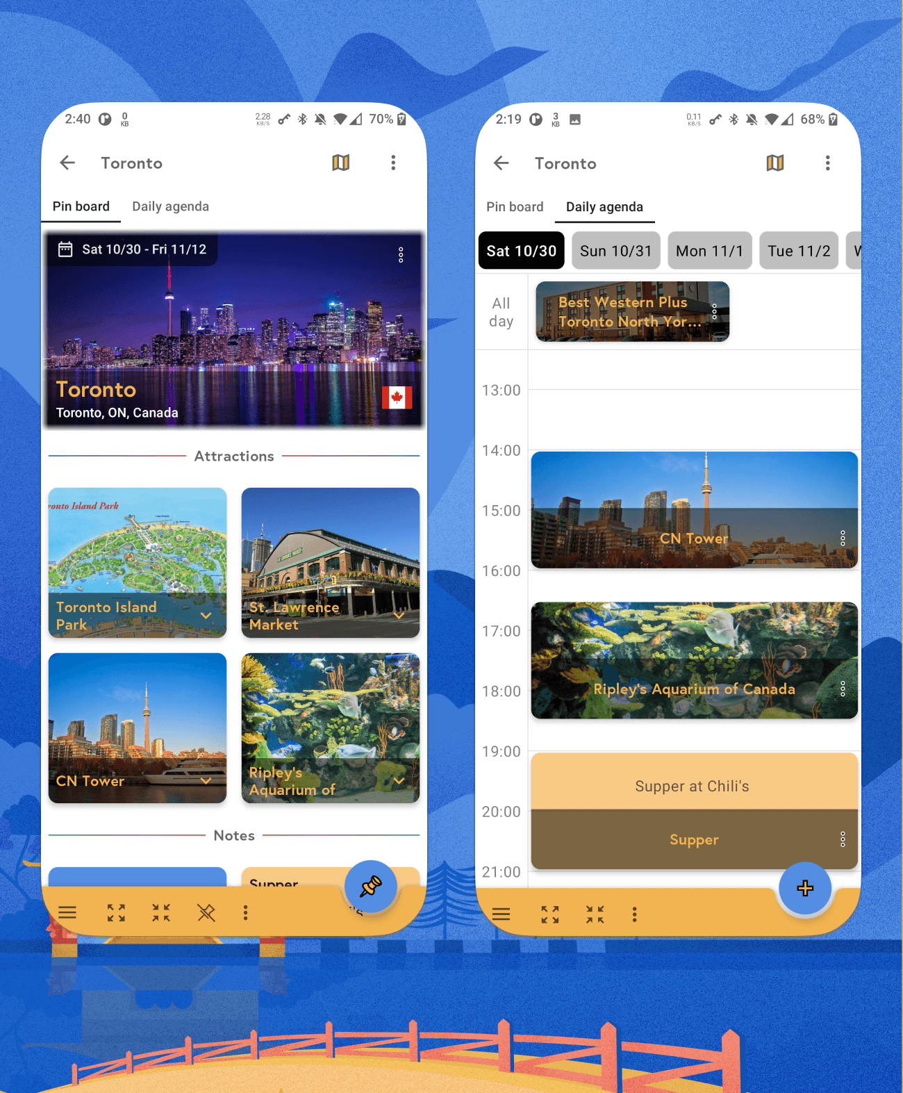 Enjoy destination-specific and trip-wide pin boards, as well as a trip timeline, where you can add the following: